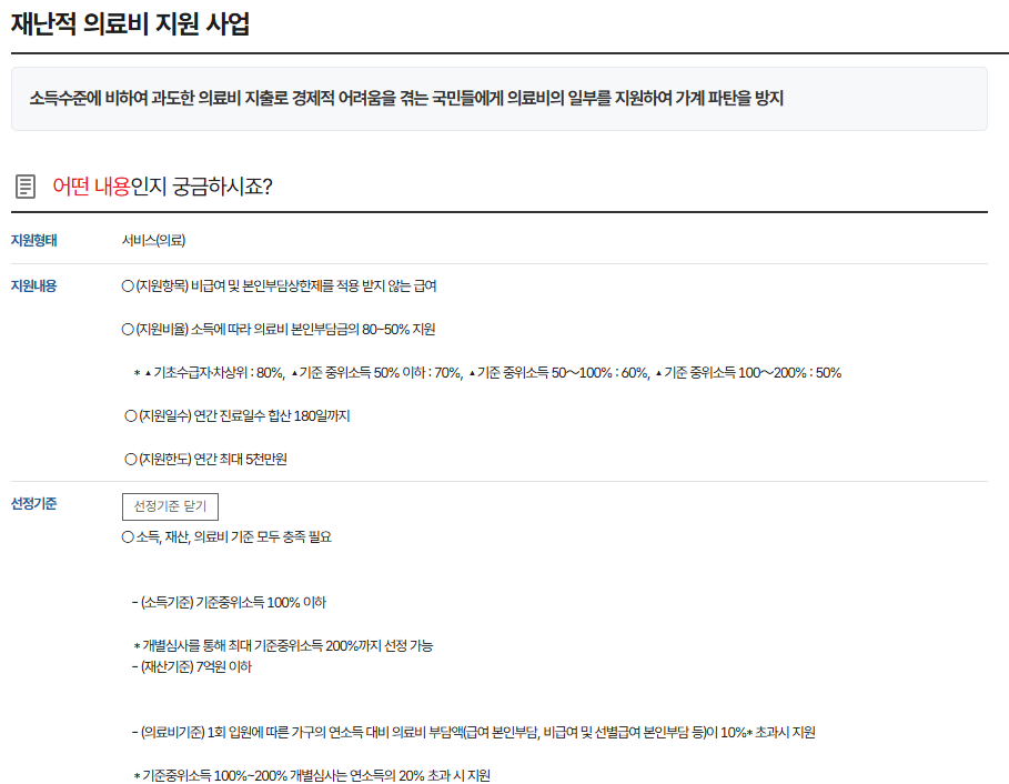 - 기준 중위소득 100% 초과 ~ 200% 이하 가구: 본인부담 의료비가 연소득의 20% 초과 (개별심사 대상)
