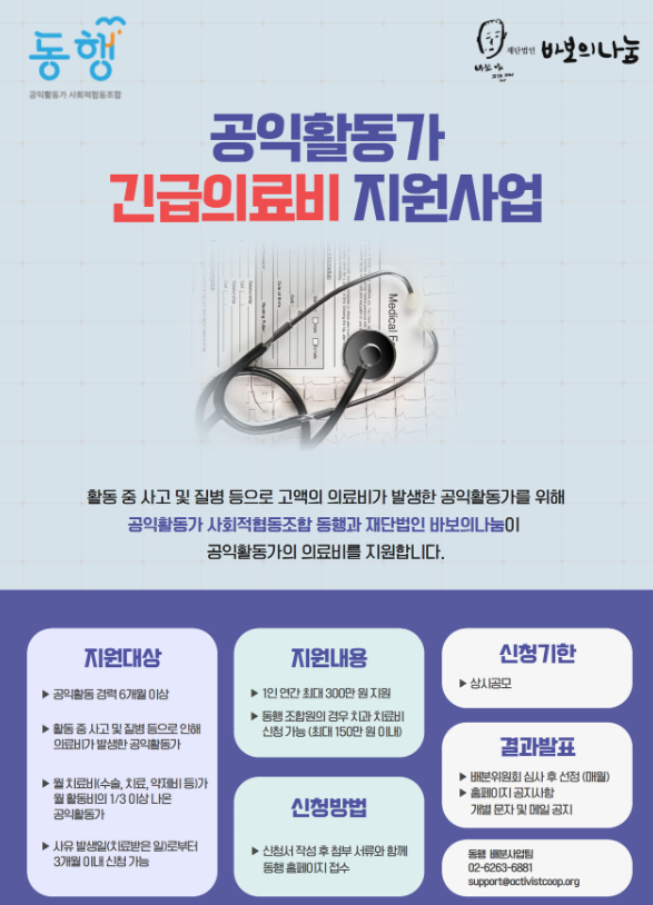 공익활동가 사회적협동조합 동행에서 운영하는 지원사업으로, 공익활동 중 발생한 질병이나 사고로 인한 의료비를 지원합니다.